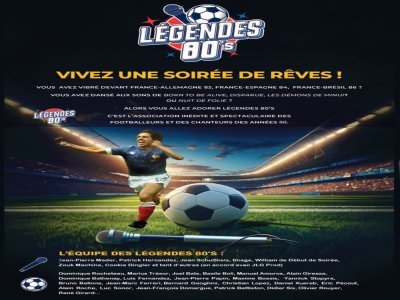 Vous avez vibré devant France-Allemagne, France-Espagne ou France-Brésil ? Vous avez dansé sur Born to be alive ou les Démons de minuit ? Alors vous allez adorer l'évènement exceptionnel « Légendes 80s » le samedi 1er novembre à 19 h 30, à la salle Le Galion de Gerzat avec une association inédite de footballeurs et de chanteurs des années 80 réunis pour une soirée de gala.