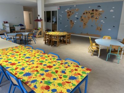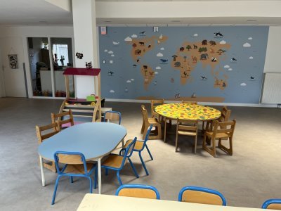 Dans cette école, les sanitaires sont rapidement accessibles. Un grand atrium avec mobilier, une superbe fresque du monde ainsi que la salle de sieste sont chaleureux.